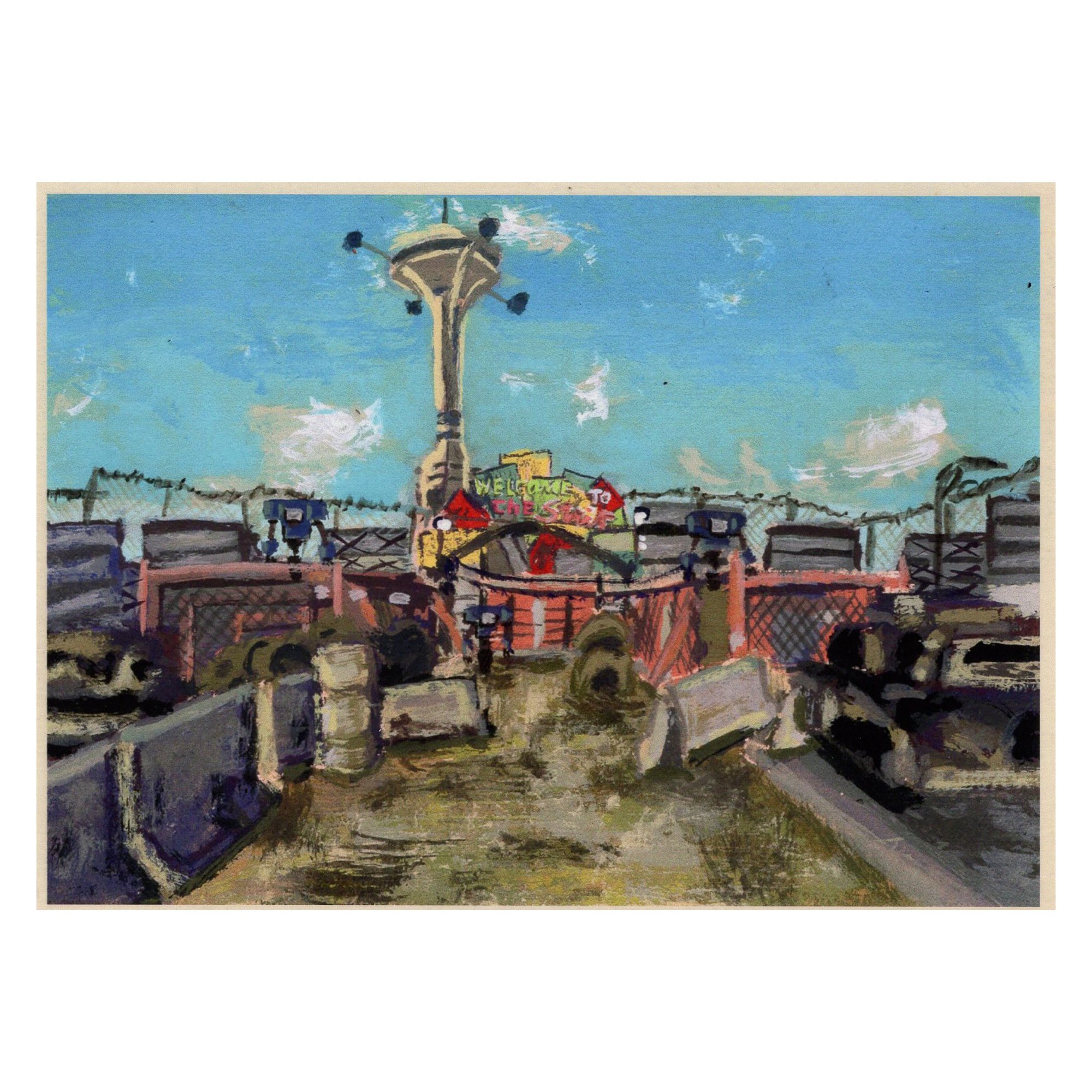 Physical postcard inspired by Fallout New Vegas and vintage postcard designs.